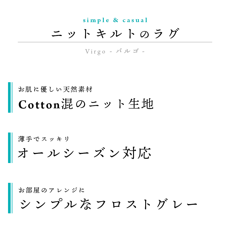 シリーズ一覧 敷きパッド 掛けカバー 枕カバー ラグ / 正方形 ラグ / 長方形 マット S マット M マット L keyword | ラグ センターラグ アクセント 敷物 リビング ダイニング ソファに 足元 やわらか ソフト バルゴ Virgo 綿 コットン お洒落 おしゃれ グレー ニットキルト キルトニット キルト ニット スウェット【MA2003】さりげないブロックキルトがお洒落なニットのラグ。