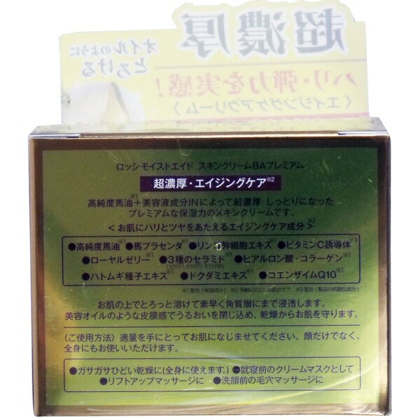 ロッシ モイストエイド 馬油配合 ホイップ洗顔フォーム 130gロッシモイストエイド 馬油 EXスキンクリーム 100gロッシモイストエイド オイルヘアクリーム 馬油ヘアクリーム 160gロッシモイストエイド オイルヘアトリートメント 馬油トリートメント 270gロッシ モイストエイド 馬油フェイスマスクBA 7枚入ロッシモイストエイド スキンクリーム ハトムギ超潤クリーム 220g【ロッシ モイストエイド 馬油スキンクリームBAプレミアム 100mL】広告文責(有)イースクエアTEL:0120-532-772コスメテックスローランド株式会社個装サイズ:72X85X72mm個装重量:185g内容量:100mL製造国:日本【発売元:コスメテックスローランド】【商品区分:化粧品】【成分】ミネラルオイル、馬油、水添野菜油、(ベヘン酸/エイコサン二酸)グリセリル、リンゴ果実培養細胞エキス、テトラヘキシルデカン酸アスコルビル、ヒアルロン酸Na、水溶性コラーゲン、プラセンタエキス、セラミド1、セラミド3、セラミド6、ローヤルゼリーエキス、ハトムギ種子エキス、ドクダミエキス、ユビキノン、ニンジン根エキス、ダイズ油、フィトスフィンゴシン、コレステロール、カルボマー、キサンタンガム、ラウロイル乳酸Na、BG、水添レシチン、水、グリセリン、レシチン、香料【ご使用方法】適量を手にとってお肌になじませてください。