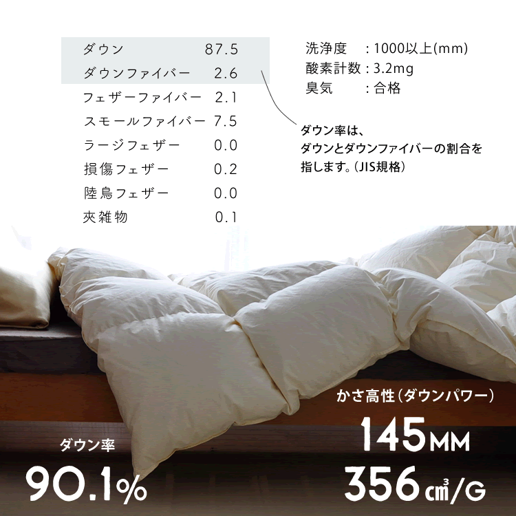 なんとかさ高145mm!!! ニューゴールドラベルとしては驚異の数値 クラス上のエクセルゴールドの数値です! ホワイトダックダウン90%、かさ高145mm かさ高145mmのお手頃クラス。